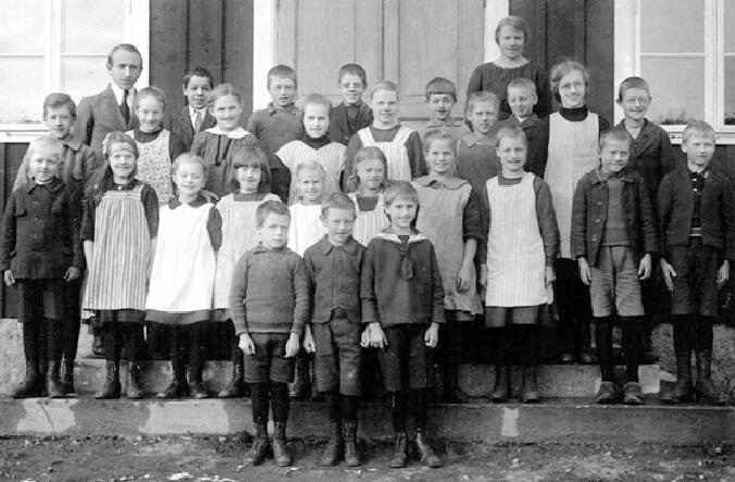 School uniforms were worn during the Tsarist era. Boys in secondary schools wore cadet uniforms. We have little information about Estonian schools after independence during the inter-war era, but we notice many girls wearing pinafores. We note boys without school uniforms right after World War II (figure 1). We note boys wearing short pants including suspender shorts. One boy wears a sailor suit. There seem some rather old boys at the back, perhaps their education was delayed by World War II. Many boys have short, cropped hair. Presumably as the country began to recover from the War, the standard Soviet school uniform became more common and by the 1950s required. Children throughout the Soviet Union wore the same uniform. Boys wore a military-styleSince independence, Estonian school children no longer wear uniforms.
