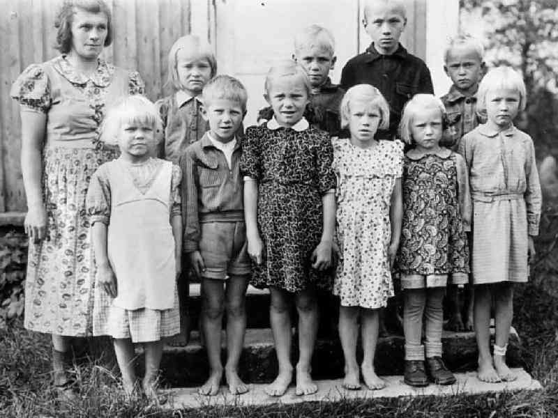 This photo was taken during 1932 in the primary school of Himalanpohja, a place in the Finnish municipality of Ristiina, in the province of Eastern Finland. We suspect this was representative of rural schools in Finland, although we do not know if the area was an average rural area. The children are very plainly dressed, although note that the clothes are not ragged. The boys weae long sleeve shirts and long short pants. The girls wear dresses with short sleeves. Some of the girls wear pinafores. All of the children are barefoot. While plainly dressed, they seem much beter off than the children we note in the rural Soviet Union.