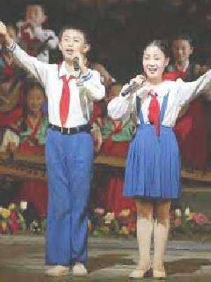 Images available from the early 2000s show coordinted white and blue uniforms for boys and girls. Here we see a boy and girl wearing their school uniforms for some kind of theatrical production (figure 1). The uniforms are worn with the obligatory red scarfe. The boy wears a white shirt and blue pants. The girl weas a white blouse with a wide collar with a suspender skirt. This photgraph was taken in the early 2000s. We have no chroological information at this time. Nor do we know if there were any differences between primary and secondary schools. We also do not know how widely these uniforms are worn. We do not know for ecample if the uniforms were worn just by a few prestige schools in Pyongang or if children throughout Korea were issued similar uniforms.