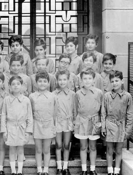 We are not sure yet about the school dress code in the 1950s. We suspct that like the 1960s and 70s that a smock was required. This was probably the smock worn in the 1950s and early 60s, but we are not yet sure. We are not sure about the color, but was probably a light blue. The smocks have large pointed collars, done in the same materail as the smock iyself. The smocks button at the collar, completely covering the boys' shirts. The smocks are side buttoning smocks done with adouble-breasted look. They have self-belts with buckles. We also note that there seem to be school rules about what the children wear with the smock. All the children wear short pants and white socks. Given the conformity, there must hav been a school rule. We note a slightly different style smock by the late 1960s. We are not sure when the change was made.
