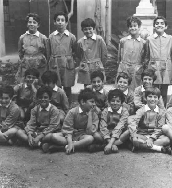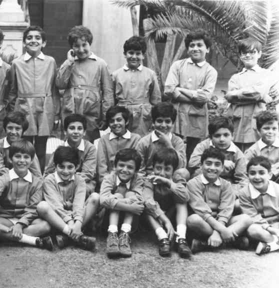 The other dated image we have is for another 8 eme class just after the one herefor the 1970-71 academic year. This image was marked 8 eme 4, suggesing that there may have been four such classes which would mean a rather large school. The boys wear the identical smock seen here. Their smocks have white collars and are center buttoning and self-belted. Although hard to see here, the smocks have two front pockers. Again the boys wear their smocks with short pants and white socks, almost surely because of the conformity there was a school rule. There was no change in the uniform. Curiously the only difference in the smocks is that there are variations in the length. Sometime between 1976 and 1977, the schools seem to have abandoned the smocks that had been used as uniforms.