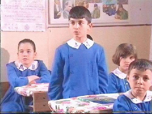 As far as we can determine, Turkey has only one school uniform garment--the blue school smock. We notice some style variations. There appaer to be both back and side buttoning smocks. The buttons can differ. Some children have blue bottons while others have white buttons. All of these smocks are made in rather short lengths. As far as we can tell, boys and girls wear the same styles of smock. There are more differences in the collar. It is worn with a wide white collars, odten Peter Pan collars. We have seen diifferent collar styles. The boy standing here has more of a Eton ponted collar. Many of the girls have collars with scalloped edging. We note that many boys and girls wear embroidered designs on these collars. We see some are the Islamic cresant and star that are a symbol of Turkey, but there are many other designs as well. The smocks seen here are a light blue. We have noted other photographs of Turkish children wearing a dark blue smock.