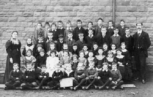 We note a photograph taken in 1893 (figure 1). We can't make out much detail from the photograph. We do notice boys and girls be educated together. Notice how many of the boys wear Eton collars. Many of the girls have lace collars. One girl wears a pinafore.