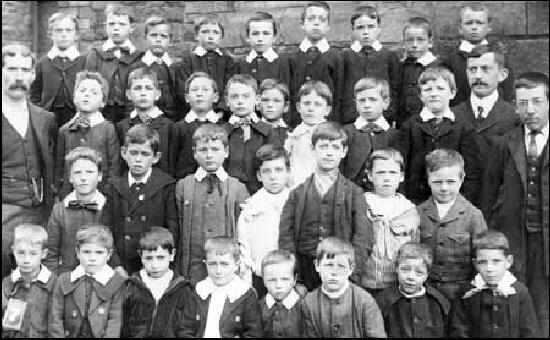 Figure 1.--Here we see a standard 3 class in 1903 the Navigation Board School in Abercynon. The classes are now separated by gender. Here we can make out more detail. Many boys are still wearing Eton collars. A few boys wear blouses with ruffled collars. |