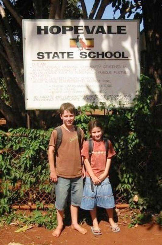 Many Australian primary schools have uniforms, often very casual uniforms. Quite a number of schools do not require any uniform at all. Here we have a photograph of two siblings at the gate of the Hopevale State School, in the Cooktown area, Queensland. Hopevale is an Aboriginal community. The school did not require a uniform. Many of the children come to school barefoot.