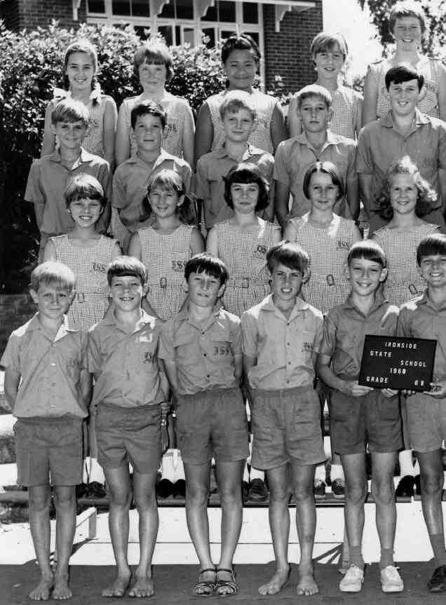 The Ironside State School is a primary school located in St Lucia. This is a suburb of Brisbane, Queensland. We have a school portrait from 1968. It shows a 6th grade class which would be the last year of primary. The school has a mandatory uniform. The girls wear checked dresses looking rather like gym frocks. The boys wear light-weight shirts and shorrt pants. This was a very common summer uniform for boys in Australia. The children in 1968 were allowed to attend in bare feet. In the photo half of the boys in the front row are barefoot. On the contrary no girl in the second row is barefoot. This once was very common in Australia, but is now much less common. The dress code in 2009 states that pupils can wear black shoes, sneakers or sandals.