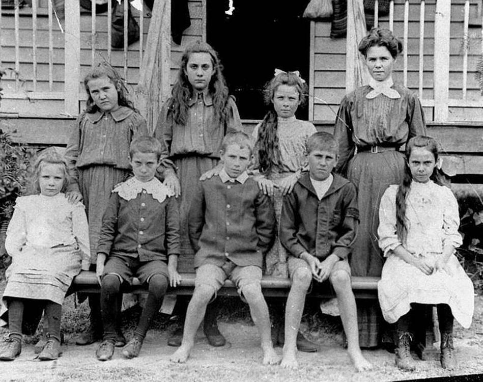 We notice a rural primary school at Lower Yarraman in 1908. The town is located in Queensland, inland from Brisbane and the Sunshine Coast. This is a portrait of the children at the school in 1908. The eight children covr the full range of primary education from about 6-13 years of age. The young lady teachers stands at the rear with the older girls. The girls all wear long dresses, and the teacher an even longer dress. Some of the dresses are similar, suggesting sisters. We notice both colored and white dresses worn with black long stockings. The outnumbered boys wear knee pants suits. The suits are intresting given the warm Queensland climate. We see a Fauntleroy lace collar, a small Eton collar, and a sailor outfit. Two of the boys are barefoot. The youngr boy wears black long stockings like his sister. The footwear is varies. We see low-cut and hifg-cut lace ups and strap shoes. A similar American photograph would hve shown mostly high-tops for both boys and girls. They are posed on a school bench in front of their school which looks rather like a rural house. Notice the the coats and bags hang on hook on the porch, the only suggestion that the building is a school and nit a house.