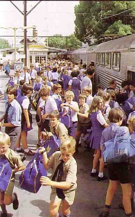 ![]() Figure 1.--This is a stop on a comuter railroad line in the afternoon after school. The photograph was taken in 1987. A HBC reader tells us that this image looks luke Sydney in New South Wales. |