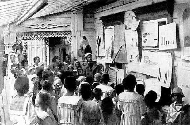 Figure 1.--Here we see a traveling school in the Soviet Union for peasant children in the mid-1920s, perhaps 1927. Notice the children all seem to have shaved heads and many are wearing sailor-styled outfits. We are not sure, but presumably the children here are both boys and girls. |