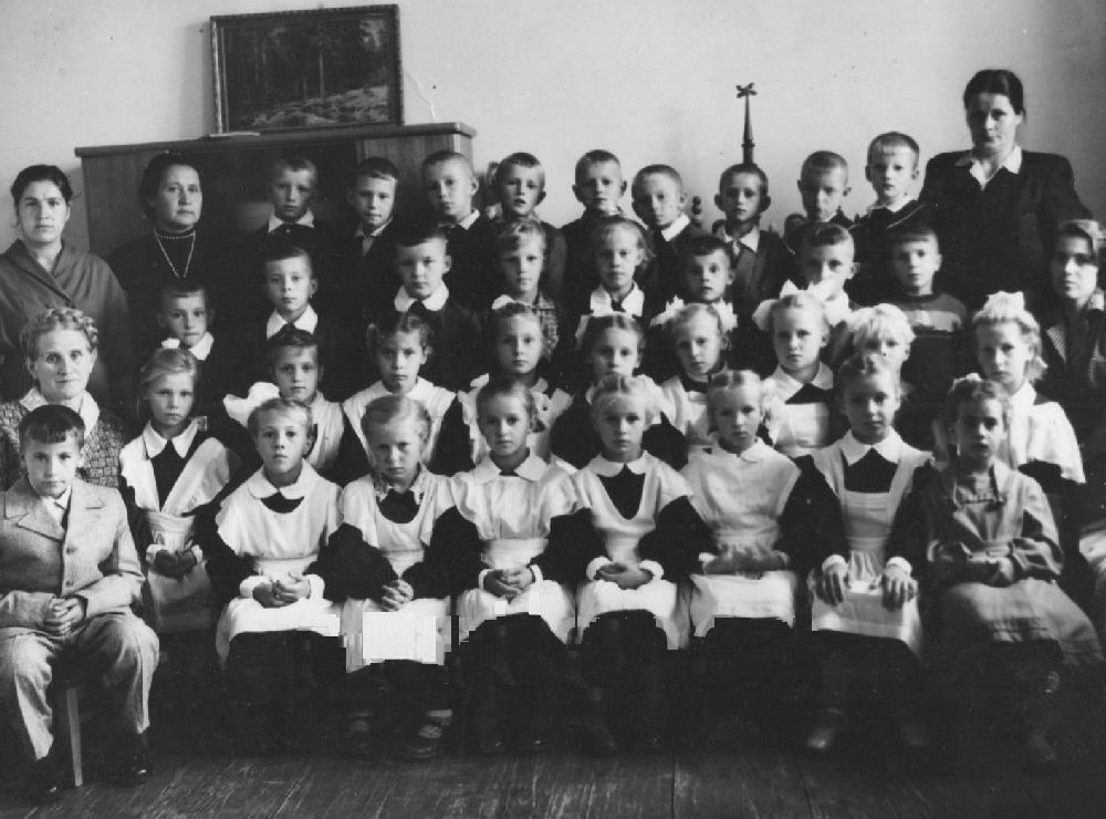 Primary schools were already well established during the Tsarist era. There was, however, considerable illiteracy. And working-class children, especially in rural aeas might only attend for a one or two years. This changed with the Revolution. The primary system was significantly expabded during the early Soviet children. Considerable resources were devoted to the effort. The primary limitation was funancing, but by the time of World War II, most Soviet children were completing primary programs. There appears to have been formal school uniform, although we are not sure about the different styles and when they were introduced. Most of our images come from after the War. A problem was that before the War because of very low-living standards may not have afforded uniforms, especially in rural areas. We note a military-looking uniform after World War II consisting of a peaked cap, tunic, wide belts, and red scarf. It is not ckear how many schools actually had this uniform. It appears to be more of an ideal, than a commonly worn uniform, especially in the early-50s. Younger boys might wear short pants, sometimes with over-the-knee stockings. This uniform persisted even after Stalin's death in 1953.