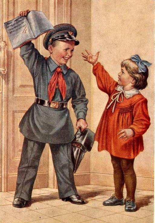 Primary schools were already well established during the Tsarist era. There was, however, considerable illiteracy. And working-class children, especially in rural aeas might only attend for a one or two years. This changed with the Revolution. The primary system was significantly expabded during the early Soviet children. Considerable resources were devoted to the effort. The primary limitation was funancing, but by the time of World War II, most Soviet children were completing primary programs. There appears to have been formal school uniform, although we are not sure about the different styles and when they were introduced. Most of our images come from after the War. A problem was that before the War because of very low-living standards may not have afforded uniforms, especially in rural areas. We note a military-looking uniform after World War II consisting of a peaked cap, tunic, wide belts, and red scarf. It is not ckear how many schools actually had this uniform. It appears to be more of an ideal, than a commonly worn uniform, especially in the early-50s. Younger boys might wear short pants, sometimes with over-the-knee stockings. This uniform persisted even after Stalin's death in 1953.