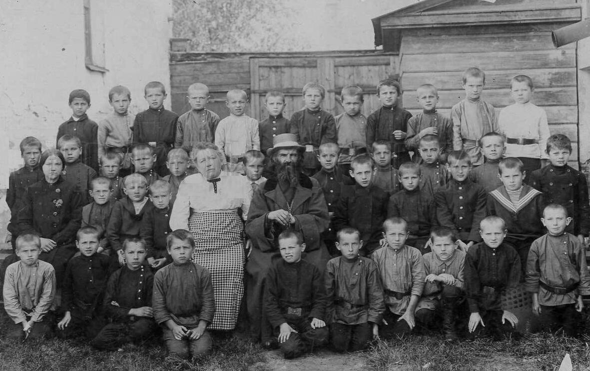 Here we have a school in Yaroslavl-Rostov. This is a city in Yaroslavl Oblast, Russia. Rostov is located in Russia's Russian heartland, northeast of Moscow. Rostov is a town in western Russia, on the banks of the vast Lake Nero. It’s known for the Rostov Kremlin, whose fortified towers (17th century). The ornate, domed Cathedral of the Assumption stands within its walls. The Museum of the Frog Princess is dedicated to Russian fairy tales. To the southwest is the restored Monastery of St. Jacob Savior (14th century). It is one of the Golden Ring cities, a group of historic cities northeast of Moscow that played an important role in Russian history. We see the school in 1915 at the onset of World War I. All the children are boys. Rural village chools were commoknly coed, but city schools where there were more children were udsully single-gender schools. The boys look to be about 10 years old. They have have close-cropped hair. Most wear the classic Russian tunics. There are two adults, a woman and older man with an impressive beard. There is also a teenage girl at the left. She may be a helper or for some reason a student. He mau be the school principal. The children are posed by what looks like the gate to the school.