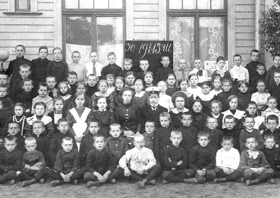 Here we have a school in Tartu/Jurjev duing 1913. This is a city in southeast Estonia southeast of Tallinn, at the time a part of the Russian Empire. Tartu has a fasinating history. The location has anient origins as a fortified place. The first written reference comes from Kievian Rus (1030). Germans played an important role in the city's history and Tartu was a part of the Hanseatic League. Russia seized Tartu (1704) as part of the epic Great Northern War. Estonia became independent at the end of World War I. Tartu is Estonia's second largest city and often seen as the country's intelectul cpital, in part because of the prestigious University of Tartu. Tartu was at the center of the Romantic nationalist movement emeging in the mid-19th century. Tartu hosted Estonia's first song festival (1869). Vanemuine, the first national theater was fonded in Tartu (1870). Tartu was also the location where the Society of Estonian Writers was founded (1872). At the same time, Estonia like Poland and the restof the Baltics was affected by Tsar Alexander III's Russifcation policies. The name of the city was officially changed to the ancient Russian name Yuryev (1893). The Russification of th University began (1895). Th Russian lanage was made compulsory in classroom teaching. With Estonian independence, the Russian imperial university was relocated to Voronezh (1918). The Estonian University of Tartu opened a year later (1919). We are not sure just what kind of school is represented here. What we see is a class with something like 60 children, both boys and girls. Other than village schools, most Russian Empire schools were single gender schools. There seem to be two teachers. Perhaps this was two classes. The man with a military cap is probably the pincipal. It looks to us like it was the entry-level class in a secondary school. The children look to be about 10-11 years old. What we do not know is the ethnicity of the children which would have included Estonians, Germans, and Russians. Cities in the Naltics tended to have relatively small numbers of the the larger national ethnic group. (There were few Jews in Estonia compared to the other Baltic republics.) We think the language of instruction would have been Russian ecause of Alexnder's Russification process, but we are not sure about that. The blackboard writing does not seem to be Cyrilic, but we only have two letters to go on. Notice the boy with a globe. The children were probably proud to have a modern instructional item. Many of the girls wear pinafores or lace collars, but we only see one small hairbow. The boys wear various garments. We think we see miitary-styled jackets, but there also may be tynics or even smocks. The boys all have short hair, but not as severely cropped as we see in many Russian schools at the time.