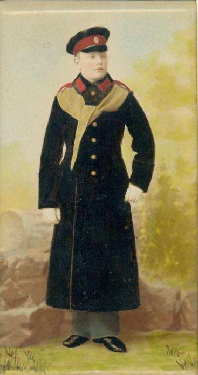 This is an hand-tinted photographic portrait of a Russian school boy. He presumably wenr to a secondary school in a city. We have no idea, however, what city. I believe that boys at all secondary schools wore uniforms. This was not a military school as such. The portrait is not dated, but one dealer suggested the 1880s. While this is a tinted rather than a colored print, we be believe the colors here areaccurately produced. A boy and the school would have wanted a realistic representation of the colors. Put your cursor on the image to see the uniform under his coat.Click on the image to see his uniform coat. Unfortunately there is no information associated with portraits here.