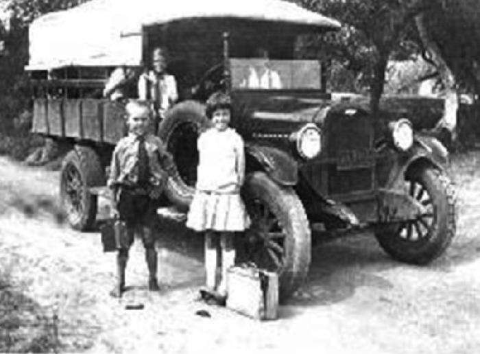 Walking to school was not possible in rural areas because of the distances involved. If the farms were particuklarly isolated, the children might have to be sent to boarding schools. Improivements in roads and transport meant that rural children could be brought more easily transported to school and thus still live at home. Thus we see schools buses brining the children to school. We are not sure hen the first school busses operated, but we note them as early as the 1920s. They were for the most part only for white children. Some private schools had their own school buses.