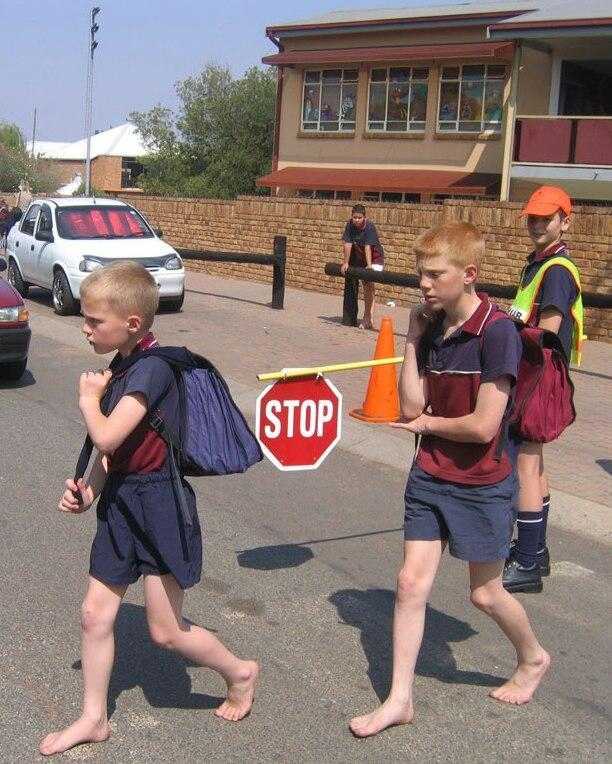 Many South African children walk to school. This is especially true of black students. But black and colored (mixed race) children living near their schools also walk to work. Some parents may accompany the younger children, especialy if they do not have older siblings at school to help. This was and continues to be the case for primary schools as the children at least in cities usually live near to their schools. This makes walking to school easy. And the pleasant South African climate means that there is no really cold weather that complicates walking to school. Children in rural areas, however, oftem live considerable distances from their school. Thus many childten have long walks. In the Apartheid era there were few busses available for black students. We are not sure to what extent this problem is being addressed in modern South Africa. Primary schools tend to be relatively small and thus have very local catchment areas. This was less true for secondary schools and private schools where is is often too far to walk. Many primary schools organize school saftey patrols where the older children are trained to help the younger children cross the streets at intersections. Schools also have lolipop ladies at major interesections. The ladies often develop close relationships with the children who they see every day on the way to and from school. Some schools have traffic saftey problems because so many parents drive the children to school. This creates serious road safety hazards directly outside the school. Some of the schools experiencing this problem have adopted a 'Park and Walk’ scheme. This ammounts to establishing a point near the school where the children can be safely dropped off, such as a park. The children then walk the short distance to the school. The schools may adopt measures such as painting footsteps on the sidewalk for the younger children to follow. The school saftey patrol may also assist with this effort.