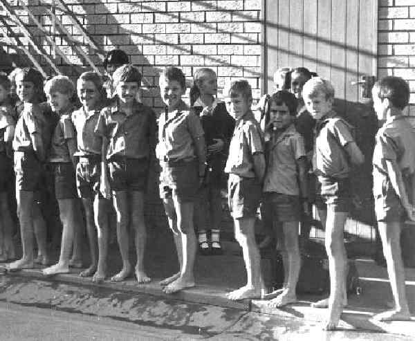 Many South African children walk to school. This was not possible in rural areas because of the distances involved. Thus we see schools buses brining the children to school. We are not sure hen the first school busses operated, but we note them as early as the 1920s. Children attending private schools were more likely to be driven to school as they were less likely to live within walking distances of the school. Some private schools had their own school buses. We see the children lining up at the begging of the school day. Uniform conventions vary from school to school. At some schools boys would come to schools in their blazers and ties. At other schools we notice the children coming to school in much more basic uniforms. We note boys wearing grey open-neck shirts and grey short pants. These are the same clothes that the children would wear during the school day. Some images show most of the children barefoot, but this appears somewhat less common in the 2000s. These basic uniforms may have been more common in the more rural schools.