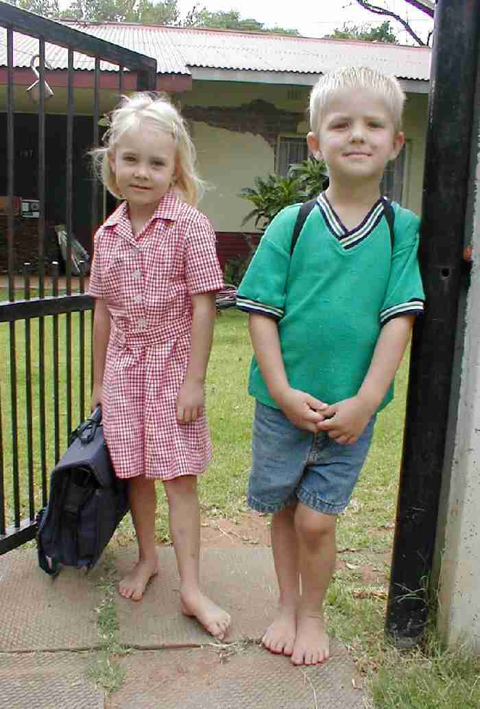 South African schools have different rules about schoolwear. Some schools let the children wear their regular clothes. Other schools have required uniforms. The trend toward casual schoolwear that we noticed in the late 20th century, continued in the early 21st century. This trend was most pronounced at the schools without uniforms. Here the younger children essentially wore play clothes to school. We also see the trend at schools with uniforms. A few schools still had traditional British-style uniforms including caps, ties, and blazers. Much more common were schools with casual style uniforms. Many schools have polo shirts or other caual shirts and shorts. The shirts commonly are in destinctive clors or have logos. The shoirts are less varied. Khaki or grey shorts are common. The girls still wore dresses, but the boys often wore open-collar polo-styled shirts and shorts. Quite a few schools allowed the children to come to school barefoot. Many children prefer this.
