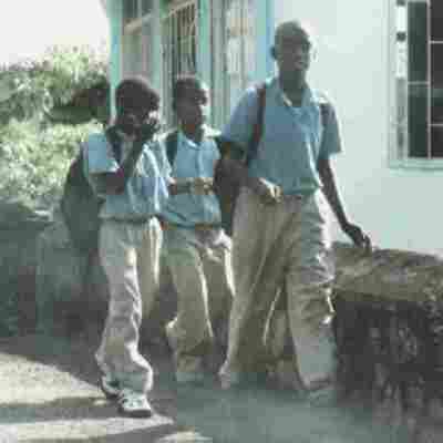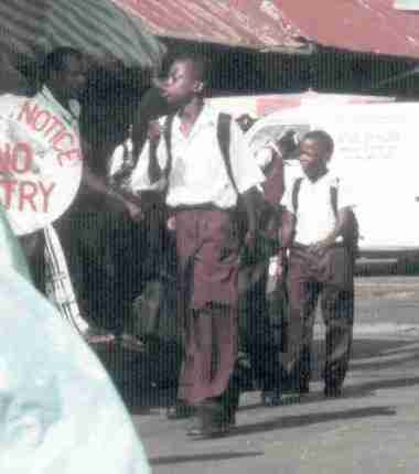 Figure 2.--Despite the tropical climate, all secondary school boys on Grenada wear long pants. The uniforms are quite simple, slacks and colored suits. |