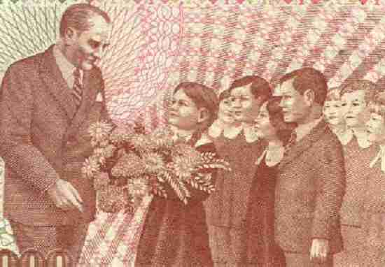 The history of modern Tukey was largely a history of Kemal Ataturk. He was one of the few hero's to emerge as hero from Turkey's participation in World War I. He is named the hero of Galipoli, where British forces in a plan promoted by Winston Churchill tried unsuccessfully to seize the Dardanells so war supplies could be delivered to Russia. After calling national congresses, he was elected President of the Turkish Grand National Assembly in April 1920. From then until his death in 1938, he remained in power in Turkey. In 1934 everyone had to take a surname and Mustafa Kemal received the surname Atatürk which means "Father of the Turks". He proceeded to guide Turkey through a series of fundamental reforms designed to implementation the secularization of Turkish society--the Atatürk Reforms. The Caliphate was abolished in 1924. Western clothes were promoted. The fez was abolished in 1925. Religious brotherhoods were supressed in 1925. A civil law code was adopted in 1926. The Latin alphabet was introduced in 1928. Women were made eligible to vote in elections and to become members of Parliament in 1934. A major undertaking was abolition of Medrases, unification of education, renovations of school programs according to contemporary and national needs, opening of new universities. A solar calendar was adopted and Moslem holy day of the week, Friday was changed into a weekday with Sunday becoming the official day of rest. at some pont, Turkish authorities adopted blue smocks, often with white collars as the uniform for primary children. We are not sure just when, but notice children wearing these smocks by the 1950s. Blue socks were worn by Turkih school children for the rest of the century. The urkish National Education Ministry (MEB) finally ended a mandtory school uniform requirement. The cabinet decision, which regulates the procedures and the bases of the new dress code in public and private schools was published in the Official Gazette (2012). The children were allowed to wear everyday attire, but MEB mandated a new dress code. New rules were intriduced. MEB forbid tights, short pants, sleeveless tops, mini skirts, transparent and torn outfits, accessories and outfits depicting political messages, make-up, bearda, mustachea and dyed hair. Girls will be allowed to wear a headscarf in the elective Quran classes. Uniforms were allowed in private schools if more than 60 percent of the parents appriove. Students were allowed to wear their uniforms in the 2013-2014 school year. ["Turkey abolishes"]