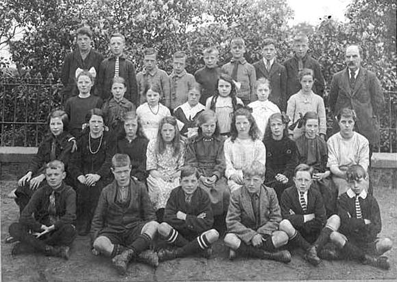 Major changes occurred in Scottish schools after World War I in the 1920s. The most obvious was that pinafores very quickly disappeared for the girls. We still see some at the beginning of the decade, but not by the end of the decade. We still see a few large hairbows, but they too became less common. Boys began wearing soft collared shirts rather than the stiff detchable Eton collars that had been so common. This was especially the case in the state schools. We still see some at the beginning of the decade, but had become the exception by the end of the decade. We see fewer suits in the state schools, but they were still common. Most boys still wore ties. Knee pants very quickly disappeared as short pants became common. And knee socks also became standard, sometimes school socks. We no longer see boys wearing long stockings at least after the early-20s. Here only one boy wears long stockings. Some girls did continue wearing long stokings but knee socks were more common with the girls as well, but not school socks. The Airdrie school here is a good example (figure 1). This is the same general pattern we see in England. One minor difference is that the sandals that became popular in England were never as popular in Scotalnd.