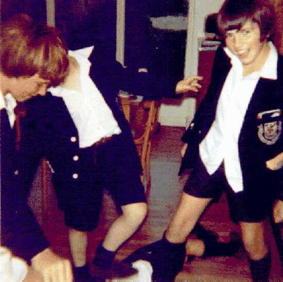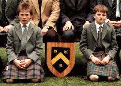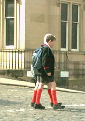 Scottish school uniforms are quite similar to English school uniforms. Essentially school uniform styles in the United Kingdom were set in much more populace England. The principal difference is of course the kilt. The only other major difference is that boys at private schools common wore colored rather than just grey kneesocks. Blue shorts were also more common in Scotland. HBC has relatively limited information on Scottish school caps. We believe that the tradition peaked school cap like the ones worn in England were standard wear for Scottish school boys. Scottish schools required blazers much as English schools. HBC knows of no important difference between Scottish and English school blazers. Many Scottish schools by the 1980s also had dress uniforms consisting of tweed jackets which were worn with kilts for dress occasions. Scottish schools have ties much like English schools. Some private Scottish schools let boys wear open collared shirts with their blazers, but never with the formal uniform of tweed jacket and kilt. The boys wearing open collared shirts generally wore them with short trousers. Most schools required boys wearing long trousers to wear a tie. Short trousers were widely worn at Scottish private schools. Not only did prep schools have short pants uniforms, but many secondary schools also required the older boys to wear short pants as well. Many Scottish schools appear to have been more traditional than English schools in this matter. Many Scottish schools used the kilt as part of the uniform. Usually it was not worn every day. More commonly the boys wore a blazer or sweater and short pants during the day. The kilt, however, is not a very practical garment for boys. Several of the elite Scottish private schools, both public and preparatory schools, had uniforms with colored knee socks (blue, red, burgandy, purple, green, and black). Red was a particularly popular color. This is in sharp contrast to English schools which usually had grey knee socks. Scottish boys have have used bookbags much like English boys. The continental over-the-shoulder type of book bag used by European boys does not seem to have been common in Scotland.
