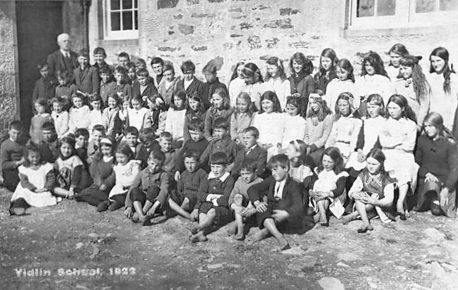 We have archived a 1922 photograph of Lunnasting Primary School in Vidlin village, Shetlands. Vidlin (in Old Norse: Vaðill meant a ford). The Shetlands was a Norse/Scandanavian settlement taken over by the Scotts (13th/14th century). Vidlin was a small village on Mainland, Shetland. It is at the head of Vidlin Voe, and is the modern heart of the old parish of Lunnasting, which was centred on the early church at Lunna on Lunna Nessm hence the name of the school. The Lunnasting stone, with undeciphered Pictish ogham inscription, found nearby. There are about 60 children. The girls wear pinafores over dresses. The boys are wearing knee pamts. Most of the children are barefoot.