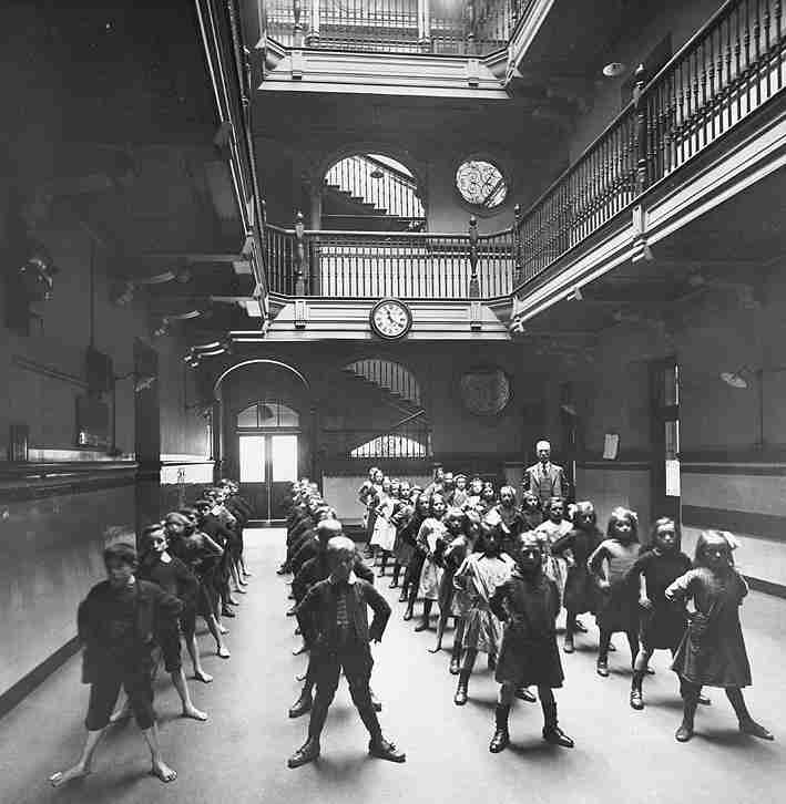 We not only see the inside of the school, but the students as well. It certainly looks to be a strictly disciplined school. The children are doing exercizes or drill in the centtal hallway of the school which looks to have been made large enough for such activities. I'm not quite sure how drill was done. My guess is that there were school regulations about this. We note several images of drll at British schools. I do not know if it was instead of or in addition to recess, often called "morning break" in Britain. The purpose was only in part for physical development, building muscles and strong shoulders. Another goal was to instill discipline in the children.