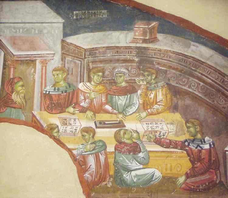 The first schools we know as in other countries after the fall of the Roman Empire were schools at courts for noble children, usially just the boys. The teachers were often clergy which were the mst likely to be literate. They might include secular people as well. The first schools for Serbian children other than the nobility as in many other European countries are associated with the Christian church. This occurred relatively late in the medieval era. The Serbs were Christainized centuriss after Western Europe (9th cemtury AD). This was also the time that the Serbs were developing the Slavic language in the form of Cyrillic. We begin to see momastaries in Serbia, many in Kosovo (12th century). The monastaries were rare centers of learmning and literacy This was about the time that the independent Serbian kingdom was established. Serbia began to form around the medieval kingdom of Raska (12th century), The Serbs emraced Orthodoxy which has since been the country's dominant church. The appearances of momastaries is important in any study of educarion because the first schools were located in these monasteries. Af first it was informal instruction and gradually took on the formal characteristivs of a school. Here we hgave a contemorary depictiin of one of rhese scgiils (figure 1). Some of these monastic school survived into modern times. [Karadžić] The Catholic church founded colleges in Vojvodina (Titel and Bac). Education as it developed during the medieval era was primarily associated with the dominant Orthodox Church. Here the Monasteries (Sopocani, Studenica, and Pec). Only a small minority of children woul have received any formal education. The Church's primary interest in education during the medieval era was in training the clergy. We are not yet sure just how much this had changed during the later medieval period.