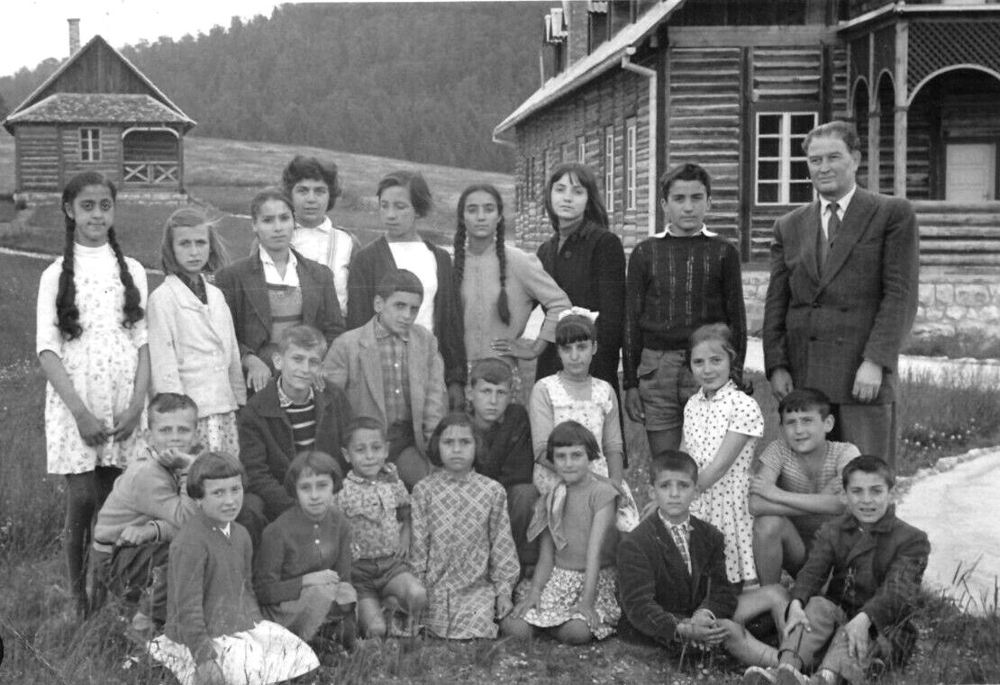 This school portrait looks to be a small rural school somewhere in Serbia. At at the time this was part of Yugoslavia. It looks like the photogrph was talen in the late-1950s or early-60s. The children where their own clothes. There were no uniforms. There were about 20 children of various ages. A well dressed teacher is pictured wih them. He had to teach ll the differnt grades. The building behind them is presumably the school. It seems rather large for such a small group. The girls wear dresses. The boys wear a variety of outfits, mostly with short pants. There is informatoon on the back whuich probalybtells us the location of the svhool, but we are unable to read it.