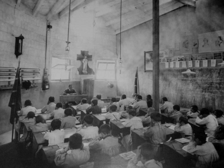 We note a well-appointed Spanish classroom in 1910 with a blackboard and a set of maps. (We are not positive about the date. It may be an estimate.) We suspectv that this was a little better appointed classroom than most children attended. Notice the the statue of Jesus at the front of the class. We are not sure, however, if this is a state school or a Catholic school. The boys have double desks. They wear white or light-colored smocks. The school was located in Barcelona. We are not sure all Spanish children wore school smocks like this. There may well have been regional differences.