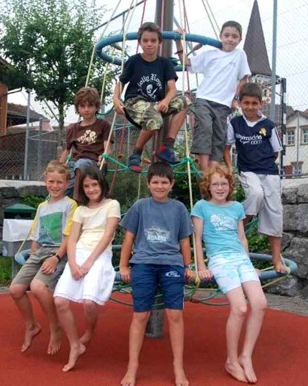 The Haslen school is a state primary school located in the village of the same name. It is Appenzell Innerrhoden Canton. We see the children in 2008 coming to school in comfortable trendy clothing. This has been a trend since the 1970s in Europe, including Switzerland. Many children wear coloful "T'-shirts and shorts when the weather turms warm. Sandals are popular and a few children come to school barefoot. That is something you do not see in the rest of Europe and in the French-speaking cantons.