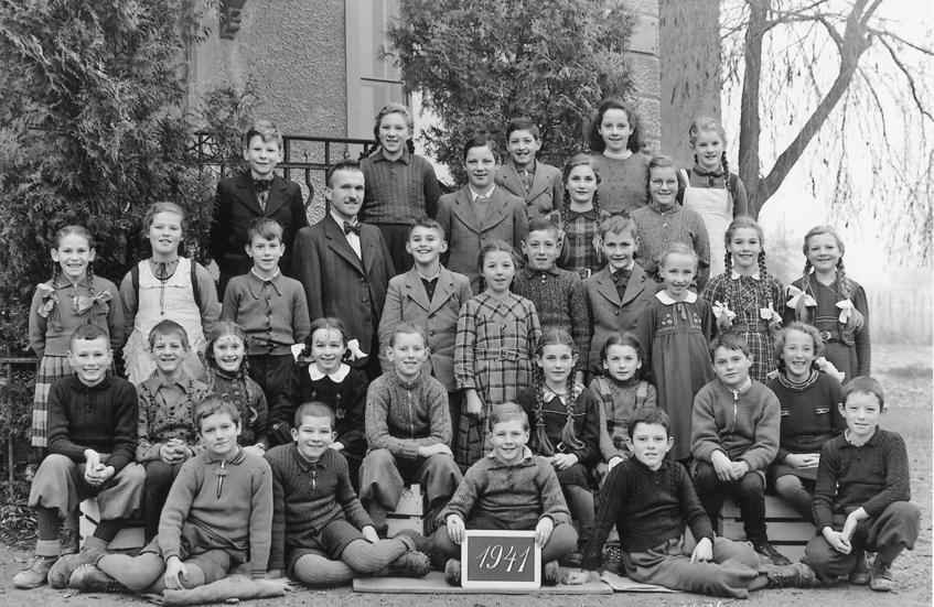 This is a class photo of 5th graders (mostly 11 years olds) at the only primary school in Oberglatt, Switzerland, in Zurich canton. The picture was taken on November 19, 1941. The young teacher, wearing a bow tie and standing in the rear, is Herr B. Dunki.