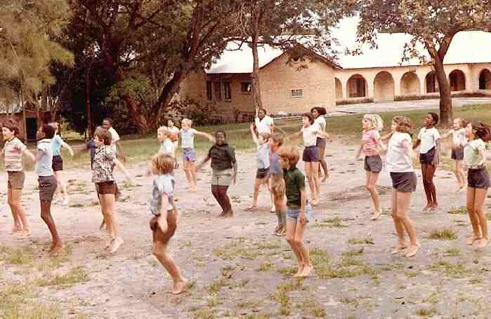 Here we have a school scene, probably from the early 1990s. It looks to be a primary school. We have no idea where the photograph was taken. We assume it is an African school, perhaps South Africa, but we are not at all sure about this. It clearly is a sub-Saharan country. This appears to be a scene from an exercise class. The school has no uniform.