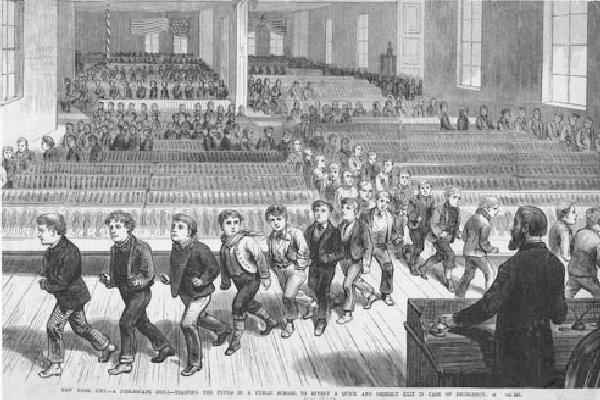 Fire is an ever present danger in croded buildings and of course children are a special concern. Thus care has to be taken so that the saff and the children know how to react in case of a fire. Schools are required. We have begun to collect some images here, but so far have very few actual images. The image here is inteesting, on part because it represents a school from the 1870s when we have relitevely few images. Note that the boys are almost all wearing long pants, but a few boys are wearing keepants which were becoming more commoin in the 1870s. We are not sure just how to interpret this image. It certainly is a large school. We rather suspect that in the 1870s there weren't that many schools this large. The detail leads one to believe that it was a depiction of an actual school. Unfortunately we do not kbnow the name of the school.