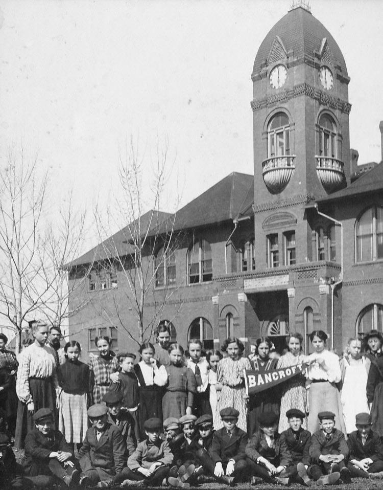 222 Here we see the Bancroft School in Bancroft, Iowa. This is a small town in Kossuth County with a population of about 830 people. It looks like an elementary (primary) school. At the time it was probably a 1st-8th grade school. Those childten who wanted to go on to high school would probably have to go to a larger town. We see the children in front of the school. They seem to be the older children. We do not see many of the younger children you would expect. We count 40 children. That would mean only 5 children per class grade. The substantial school in the back is clearly made for more than 40 children. The portrait is undated and very difficult to date because we can't tell if the boys are wearing knee pants or knickers, the easiest way to differentiate the 1900s and 10s. We would guess the portrait dates to the 1900s because we think the boys are wearing knee pants, but it is not at all clear because they are all sitting down. One child who looks like a boy seems to be wearing a smock, but we think that the child must be a girl with short hair. We think they would be more common in the 1910s. The boys are all wearing suits. Notice that the boys were nold to wear their caps, but the girls were told not to wear their hats. The portrait is a large size cabinet card. The photo is approximately 6.5 x 5 in while the card matt is 7 x 9 inches. This would suggest the 1900s, but the mount color was not the common ones in the 1900s.