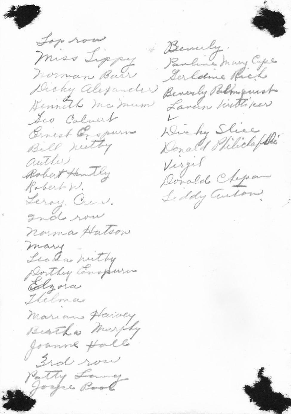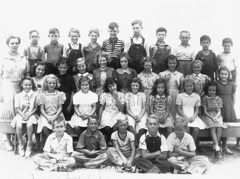 This school portrait show the teacher and her 4th grade class at the Bellevue school in Illinois. This would be children 9-10 years old. The portrait is not dated, but we would guess ws taken in the late-1930s, although the early-40s is possible. Bellevue is a small town in Peoria County, Illinois. It is located in central Illinois, a farming area which is why you see all the overalls. Today Bellevue is a part of the larger Peoria metropolitan area. There is a saying in American politics and culture, "Will it play in Peoria?" This meant that Peoria located in middle America was a good test of American tastes and values. The phrase originated during the vaudeville era of the earl-20th century as big city enteriners could easily travel around the country. It was popularized in movies by none other than Groucho Marx. America has changed a lot since then, but the election of Donal Trump shows that it has not entirely lost its currency. The boys wear a few T-shirts, but mostly collared shirts which the boys all ticked in. As far as we can tell, the boys all wer long pants, quite a few overalls. Notice how one boy has cuffed his overalls. We suspect that this was a size issue and not fashion. The 1930s was the last decade we commonly see oiveralls. They rapidly disappeared in the early-1940s. The girls all wear prim dresses. The names of the teacher and children are written on the back.