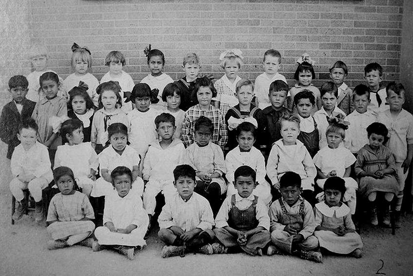 This Globe elementary primary school contains a number of Hispanic and Native American children, apparently. There seem to be a predominance of boys although we see a few girls. I think this must be the first grade because the kids look very young, no older than six in most cases. The variety of clothes the boys wear is striking--overalls, white shirts with short pants and knee socks or short pants and long stockings (one boy on the extreme left is obviously wearing white long stockings with supporters), but even long trousers are evident in a few places. A few of the girls have very large hair bows, and we notice one boy in a dark sailor suit. One boy has a dark short pants suit on. We note that the first grade class is much smaller than the higher grades. We suspect a lot of the children dropped out before finishing the full 6 year program.
