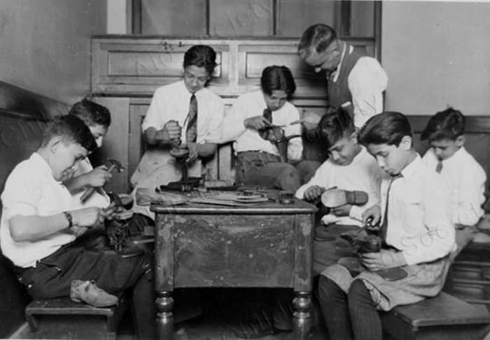 This photograph shows learning the trade of shoe-mending or cobbling in a trade school in New York City called the Italian School. The school specialized in training imigrant children in various useful trades and manual occupations. The boys seem to be about 12 or 13 years old. I'm not sure who set up the school. It might hve been part of the settlement house movement. The Brooklyn Italian Settlement was particularly well known. The term Italian School may have been because it was in an Italian community, not because only Italian boys were accepted. The boys are neatly dressed in white shirts with ties, above-the-knee knickers and long black stockings. The photographer is the famous Lewis Hine, who took many photographs of boys in New York and other cities, mostly in the 1900s and 1910s to document child labor and living conditions. This photo is dated 1928. Italians in American were noted for establishing their own businesses. Some began with little capital, pushing carts selling just about everything. Many of these cart men went on whith the money they earned to set up grocery stores, small retail shops of many descriptions, shoe repair shops, and others. Other etnic groups were more known for working in factories. Many did not pursue unibersity educatiin and the professions. This did not chhange until World War II. By this time a fine public school system had prepared immigrant children for university studies and the GI bull gave them the financial ability to enroll.