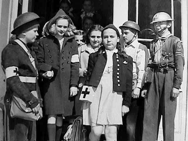 American including school children watched terrible scenes of the War in Europe and China in movie newsreels. After Pearl Harbor, no olne really knew what to expect. Neither the Japanese or Germans had planes thst could reach America, but the Germans did launch U-boat attacks all along the Eastern seaboard. Schools all over America practiced air raid drills. Some school principals took civil defense preparations very seriously. Foreign armies entering America wwere unthinkable, but also was the stunning Japanese attack on Pearl Harbor. Here we see a 1942 scene at Jackson School in Allentown, Pennsylvania, presumably named after President Andrew Jackson. The photohraph was taken a few months after Pearl Harbor, probanly in April or May 1942. The children are praticing an air raid drill. Three childern (of course justv the boys) have metal army helmets. One boy is wearing his a Cub Scout uniform. Another boy is a safty patrol. One girl wears a Red Cross nurses outfit. Two boys also are wearing Red Cross arm bands.