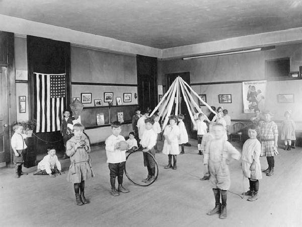 The Johnston School was located in Detroit, Michign. We do not know much about the school, but it was a public elementary (primary) school. It seems to be a fairly typical public elementary school at the time. The one photograph we have shows the children playing and exercising in May 1919. We note children with balls and an exercise hoop. Some children seen to be using barbells. And children in the back are doing a May Day pole. It is not clear if this was their classroom because there are no desks. Perhaps they have moved them out of the way for a play session. We suspect that it was a special room because desks at the time were fairly heavy, too heavy for younger children to easily move. It is not, however, a gynasium. The children are having a play/exercise session. Perhaps it was a rainy day. The flag is hung prominantly as was common in American classrooms. There is a poster on the backwall, but unfortunately we can't read it. The girls all wear dresses and the boys knickers. All the children wear black long stockings.
