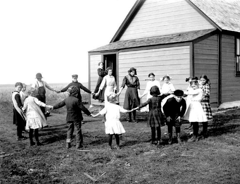 Here we see a great photograph of children playing a ring game at a one-room school on the Great Plains. It was taken near Milton, North Dakota during 1913. We are guessing the name of the school was the Milton School. It may have been the Huit School. Here we are not sure. American schools were often called "little red school houses". We're not sure what color the school here was painted. It does not look red. Nor do we know just what game the childre are playing. Perhaps one of our readers will recognize it. We thought at first the teacher had joined the game, but she is in the doorway of the school. There seem to be some older girl students, but no older boys.