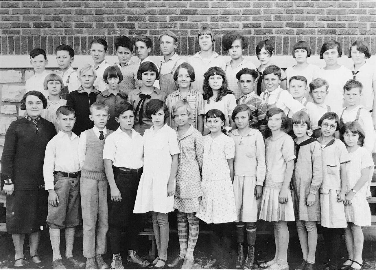 Here we see the 7th grade class at Overland Park, we believe in the very early-1930s (figure 1). The late-1920s is possible. The 7th grade means children 12-13 years old. In farm areas sometimes sloghtly older children weere involved. Many primary schools at the time ran through the 8th grade. A lot of kids did not continiue on to high school which began with the 9th grade. We see a typical sized class, 36 children. We see what looks to at least 6 farm children with boys wearing overalls. This was very common in the 1930s, but disappeared entirely after World War II (1941-45). We see a lot of white shirts, still mostly long -sleeved shirts. Only three boys clearly are wearing ties. Two boys in theb back riw may be wearing ties. There are two boys who possibly are wearing ties in the last row (the third from the left appears to be wearing a tie around his collar but wearing the collar open it is hard to tell and the boy fifth from the left appears to be very dapper and also wearing a tie). Most of the boys are in the back, but two of the boys in the front are wearing knickers, one with knee socks and the other with long stockings. One boy wears long pants. Only two girls seem to have hair bows. Only one girl has long hair. The girls are all wearing dresses, mostly with long stockings, but only one with black long stocings which were the domiant color for many years. One girl has patterned long stockings. The long stockings are interested given that this looks like a portrait during awarm day, probably in May or June.