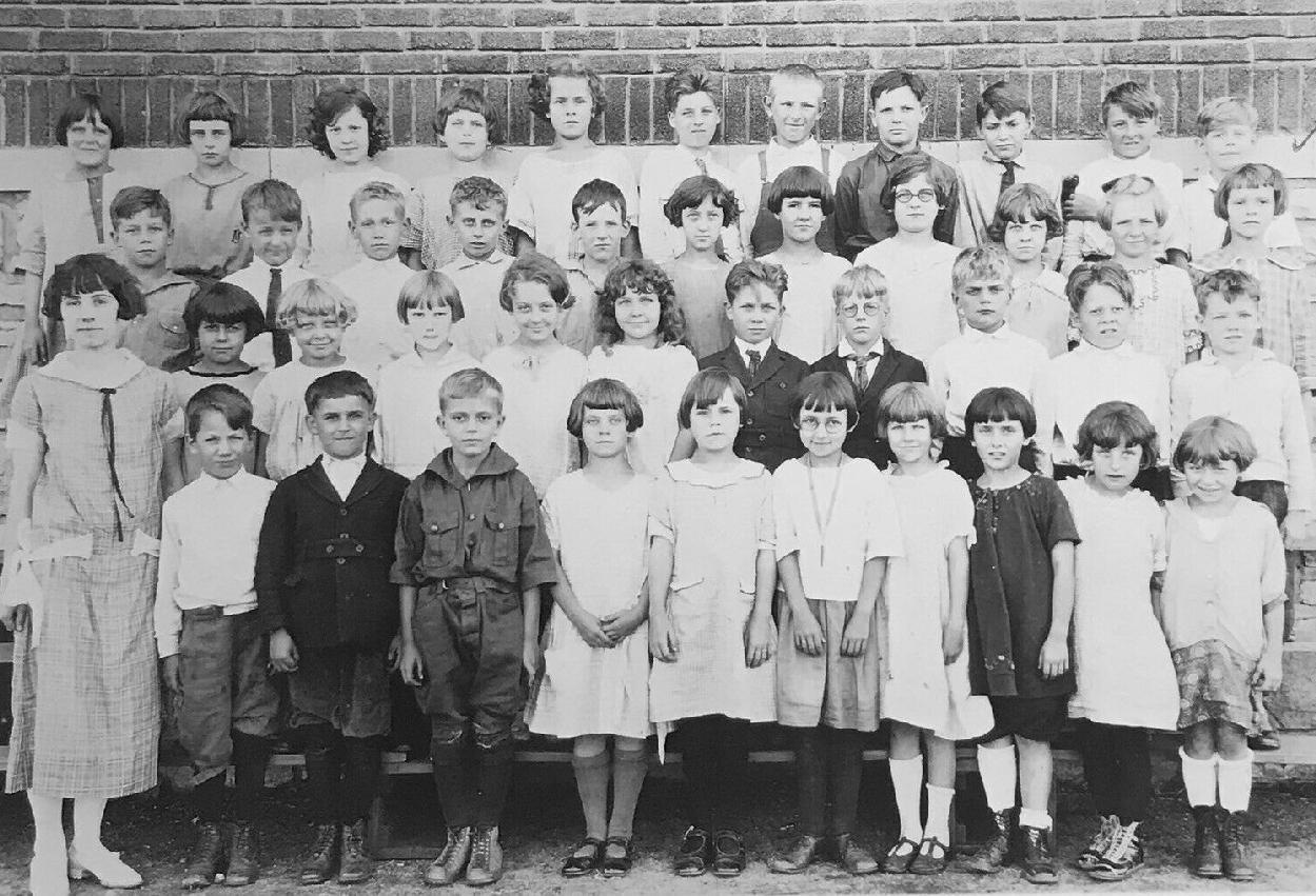 Here we see a younger class from Overland Park, we think in the 1920s. It is a fairly large class -- 32 children. The grade is not identified, but we would guess a 2nd or 3rd grade class. It looks to have been taken in the 1920s. It clearly is taken after World War I and the knickers with black long stockings is a good indicator of the 1920s. We see a lot of white shirts. Three boys wear suits. Several others wear ties. Only one boy wears overalls. We see a later class portraits with more boys wear overalls. The boys we can see in the front all wear knickers with long stockings. We don't see the girls wearing hair bows which were virtually universal in the 1910s. Thhe girls wear dresses. We inky see one girl with a blouse and skirt. The girls wear both socks and long stockings. Only the girls wear low-cut shoes. We think that the 1930s photograph is the samevckass 4-5 years alter.