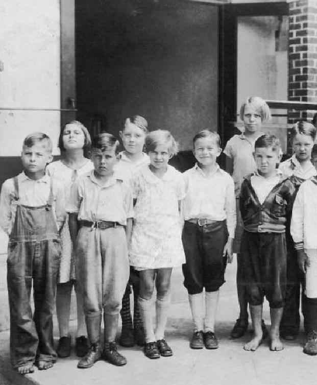 We note the boys in the 1920s wearing a variety of outfits (figure 1). A few boys were wearing sailor suits. Several boys wear collared shirts. One boy wears an Oliver Twist suit. One boy wears overalls. The other boys wear both short pants and knickers. Many of the boys are barefoot. The girls all wear dresses. I'm not sure what grade we see here, but was probably third grade. A reader writes, "The 1920s image here is interesting because Interesting photo because of the variety of dress. One boy wears a sailor suit with knee pants and black stockings and the boy in