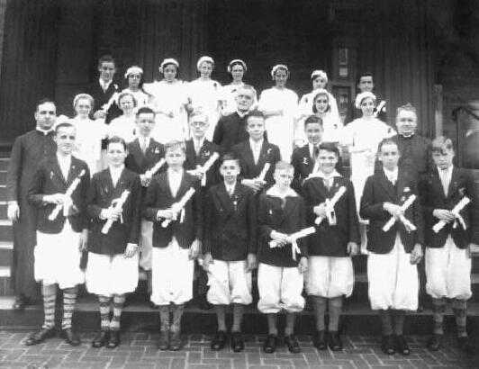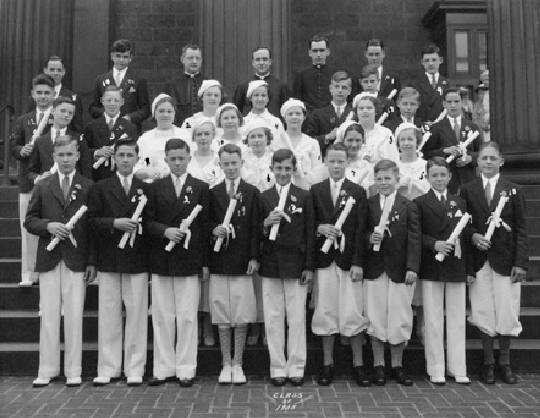 Graduation ouffits varried over time. We see the boys wearing white suit jackets with white knickers in 1930. The suit jackets may have been from suits the boys already had. The white knickers would have been purchased specially for the graduation. Apparently the schoo initially insisted that the boys wear white knickers and not white long pants. Apparently the school allowed boys to wear long white pants for their graduation. Boys in that year wear both knickers and long pants. After that year all the boys wear white long pants for graduation. Most of the boys in tghe 1930s wear boldly patterened knee socks, but a few boys wear long stockings and ankle socks. Also notice the sporty two-tone shoes. The girls wear white dresses, I believe with white long stockings. Graduation outfits were not what the children normally wore to school. Unfortunately we do not know whatthese boys or the younger boys at school normally wore to school.