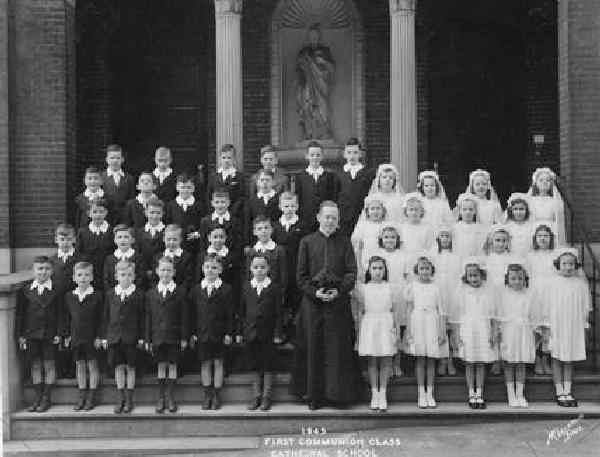 Portraits are only available from the 1940s. Boys were wearing dark short pants suits with Eton collars in the early 40s. I'm not sure if the boys are wearing Eton suits, but they look like the suits without lapels that were popular for younger boys. They clearly are wearing Eton collars. Some of these suits by the 1940s were also worn with Peter Pan collasrs. They began wearing white short pants suits in 1947. With the white suits, footwear varied. The girls mostly wear white dresses, but not as fancy as the minatire wedding dresses we have seen some children wear. In some years the girls are dressed more uniformily than in others. The 1940 portrait shows some girls wearing regular instrad of shite dresses. Later portraits show the girls wearing junior wedding dressdes with veils.