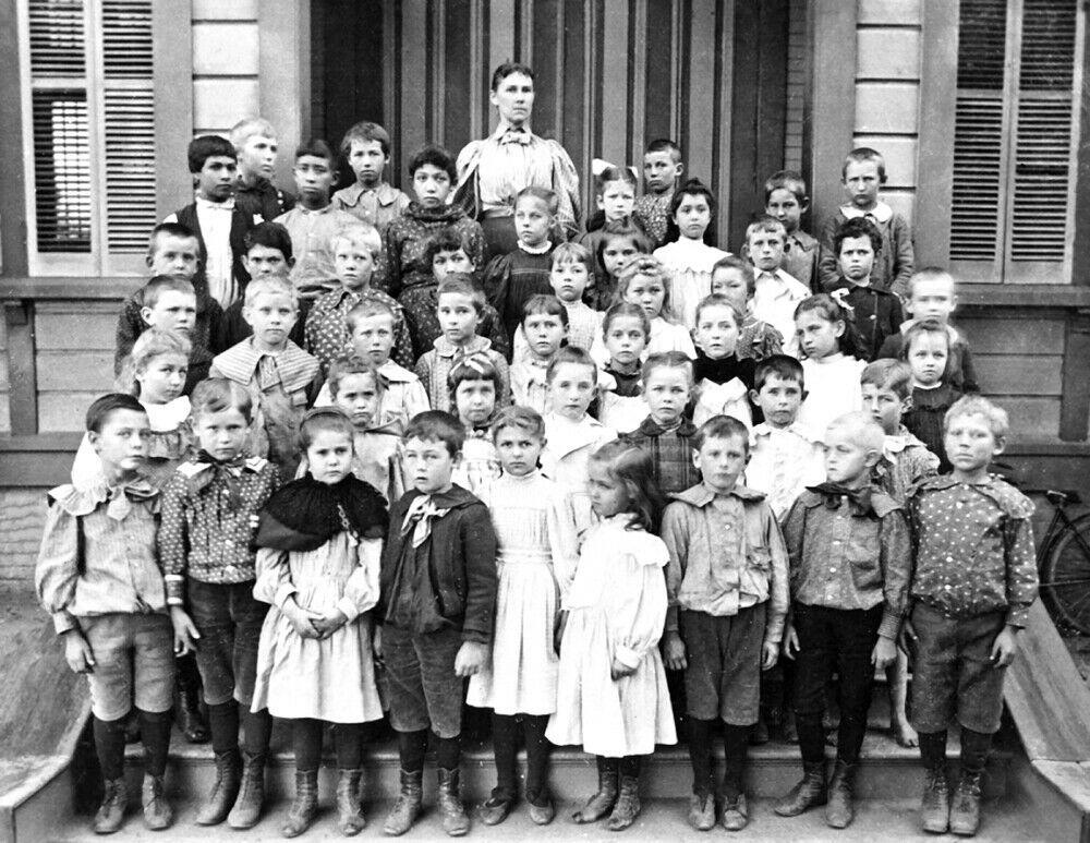 The names of American primary schools are confusing they are called elemenatary, grade, and gramamr schools, but they all mean the same thing--primary schools. This usually means the first 6 years, but this varied a little from state to state. Tustin is not a well-known California city. It is located in Orange County, California, within the Los Angeles metropolitan area. The portrait we have found is from 1896. At the time, Los Angeles is not the mega city it has become. Here we see aschool marm overlooking her class. It is a rather large class of about 50 children. Given that this the beginning tonread year, iy is way too many. The 1896 class looks to be 1st Graders. Most of the boys wear fancy, coloful blouses with knee pants. One boy wears a short, but most wear the fancy blouses. We see a lot of noys weating these blouses in the 1890s and 1900s. The school image here is a good example. A few boys wear suit jackets. The girls wear dresses, a few with pinafores. White dresses seem popular. Only a few boys wear white blouses. A few of the girls wear hair bows, but they are not nearly as popular as they will become in the 20th century. All the children wear dark long stockings and most wear sturdy high-top shoes.