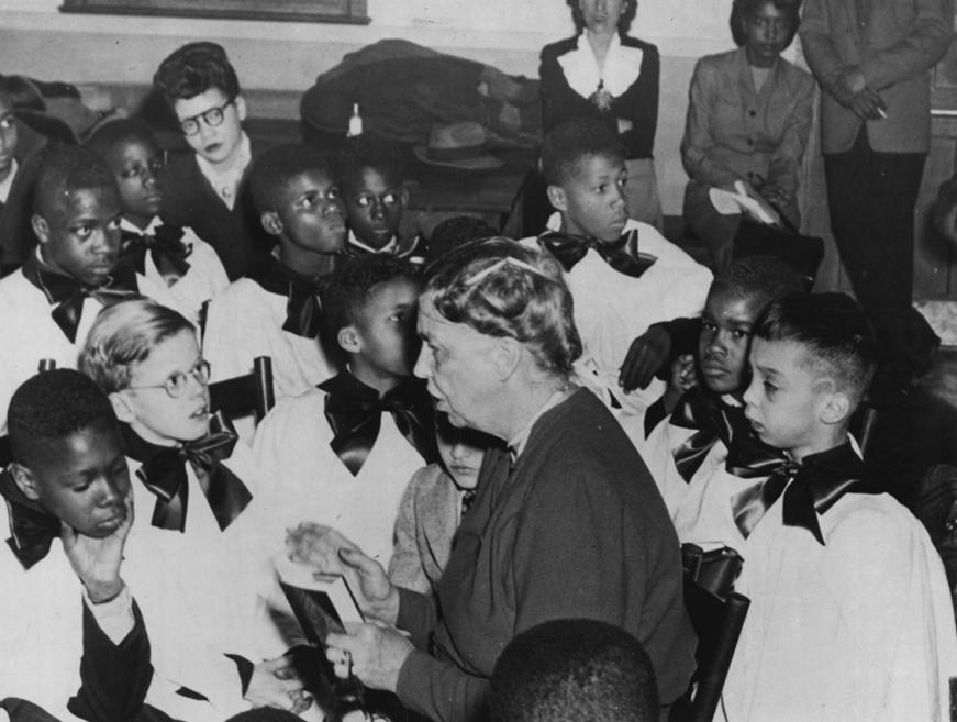 The Episcopal City Mission Society (ECMS) opened the Wiltwyck School for African American juvenile delinquents (1936). The boys were not yet involved in major criminal activity. New York state did not have segregated schools in the 1930s, but Church authorities decided it was best to have a separate facility for African-American boys. Few of the boys would have come from Episcopal families. The school was located in Esopus, New York. This was a beautiful location in the Hudson River Valley. Part of the idea was to get the boys out of a bad situation in the inner city into a beautiful country environment. The school was situated on the opposite side of the River from the Roosevelt's family home at Hyde Park. There was no connection with the President or Mrs. Roosevelt at the time. The school reportedly had some success working with often troubled boys. They had grown up in poor slum neigborhoods of New York City. The ECMS had difficulty fully funding the school and during World War II was having to consider closing it (1942). It is at this time that the First Lady got involved. Mrs. Roosevelt took an interest in a wide range of charitable activities. She was especially interested in efforts to help Afro-Americans. She helped reorganize the school and obtained needed funding. One major change was that the exclusive operation for Afro-Americans was ended. And the school took in both delinquent and neglected children. Mrs. Roosevelt was appointed to the board of directors. The ECMS subequently ended its association with the school. And the school becme an interracial treatment center for pre-teen boys between the ages of 8-12 years of age. Because of the age of the boys, the school did not have to be run as a strict reformatory. The school was financed through chritable contributions and Mrs. Roosevelt's assistance was thus very valuable. Mrs. Roosevelt continued her association for the rest of her life. She not only helped with the funding, but was involved in other ways. we note picnics durung the summer for the boys at Val-Kill, the home the President built for her on the Hyde Park estate. She also sponsored an annual Christmas party (figure 1). Just before she died she was involved in fund raising activities (1962). The school finally had to close because of funding problems (1981).