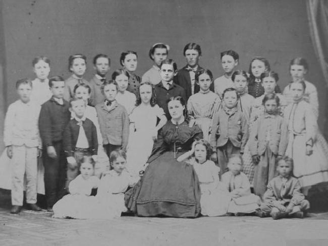 This is a Civil War era salt print of a large group of school children with their young lady teacher. This portrait was taken in the 1860s, but we do not knpw the exact date. Nor do we know where it was taken. One interesting note: The face of Edwin Christian, standing in the center above the teacher, has been superimposed over the original photograph. We have know idea why. Perhaps he moved during the exposure spoiling his image. (Exposures in the 1860s were still rather long.) His sister Anna Christian is standing to his left. Anna Christian's right hand is resting on the teacher's left shoulder. The two siblings are identified by the caption under the photo "Ed Christian in center. Anna Christian to the left of Ed Christian." Most of the boys wear long pants suits, most sack suit jackets with lapels. Two of the younger boys wear cut-away jackets and the youngest wear tinic suit, one boy with bloomer knickers. Notice that there is no indication of sailor-styled clothing.
